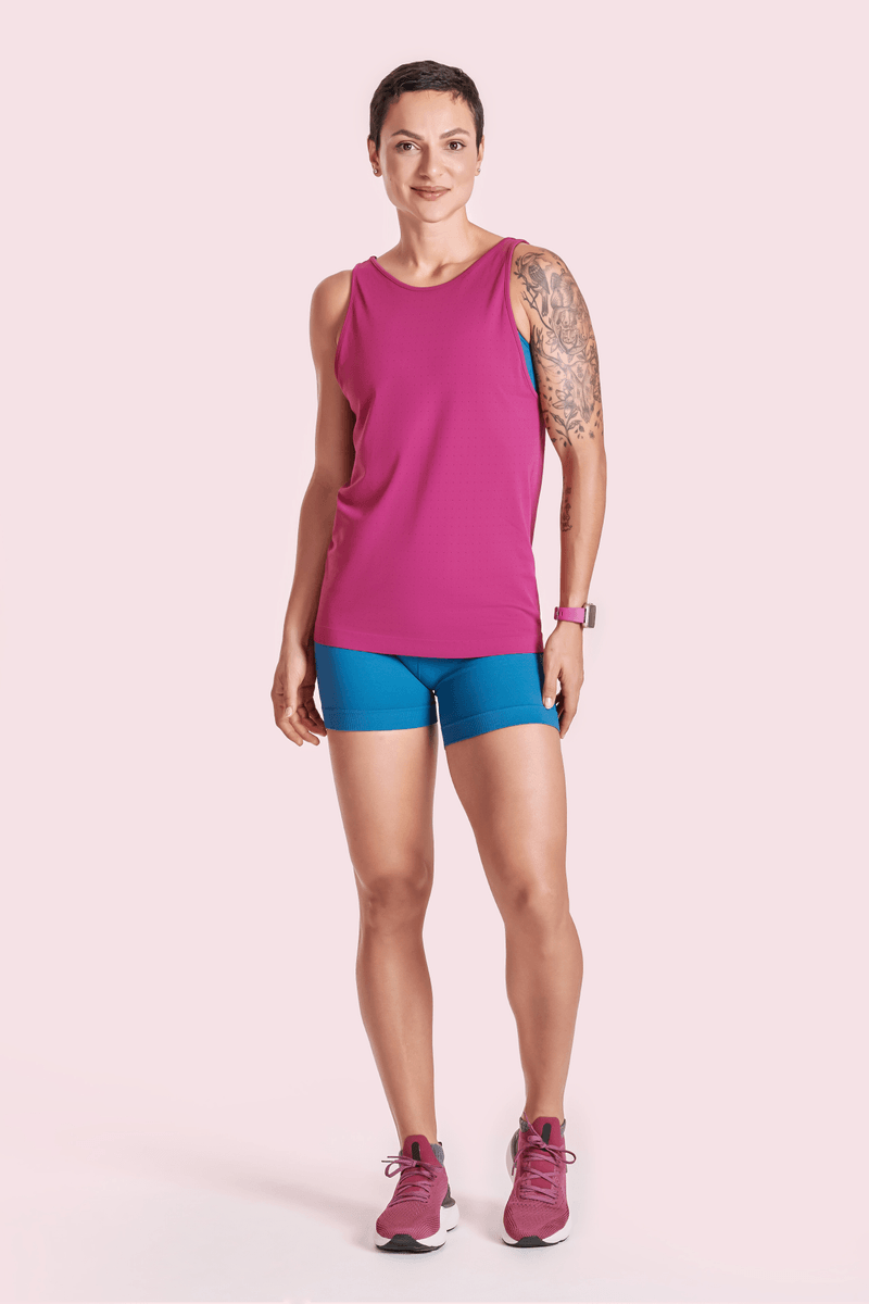 Regata feminina sem costura com decote nas costas, toque leve e modelagem reta. Possui detalhes de furinhos nas partes do corpo, deixando a peça respirável e com fácil absorção da umidade. Ideal para atividades externas como corrida e beach tennis.