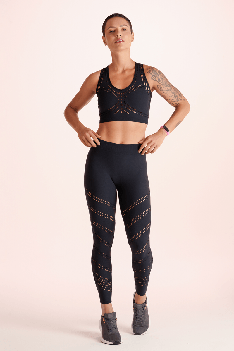 Top sem costura com a tecnologia Raschel. Possui modelagem alongada, decote V, costas nadador e trabalhado em pontos arrastão de diversos tamanhos que constroem desenhos na peça, entregando um estilo único. Ideal para atividades de baixo impacto e uso casual.