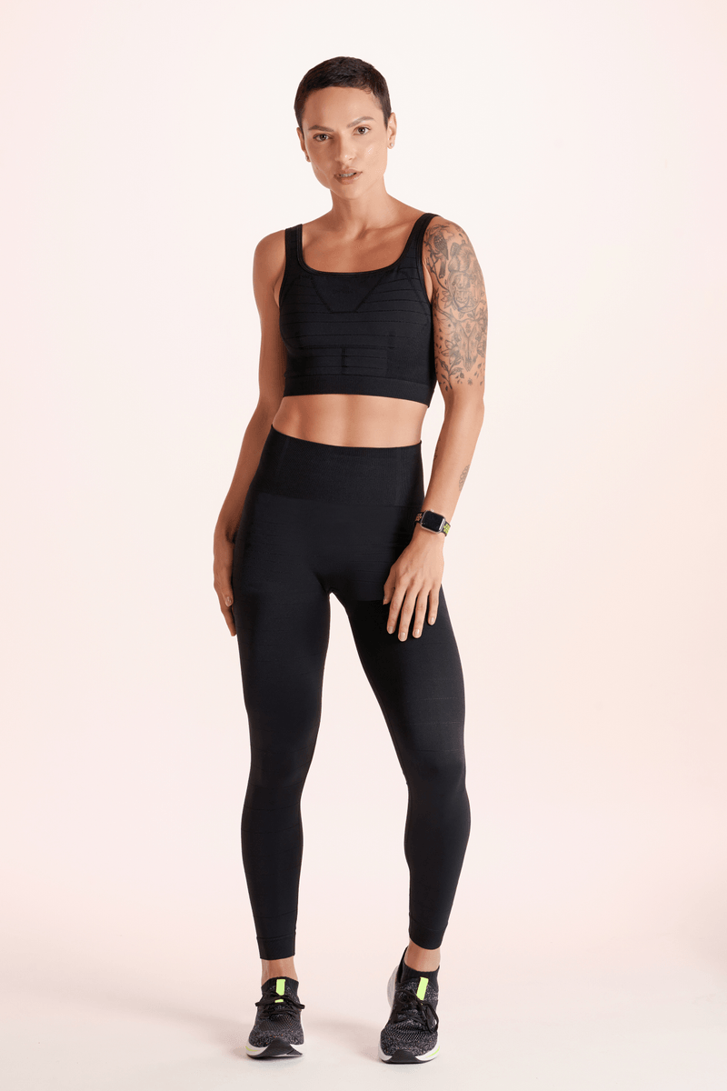 Top sem costura com modelagem alongada, base em poliamida brilhante, trazendo uma leve cintilância e textura lisa ao produto. As linhas e pontos desenham o top no corpo e trazem uma informação de moda. Possui decote quadrado e alça média que acomoda bem o busto, com média sustenção.